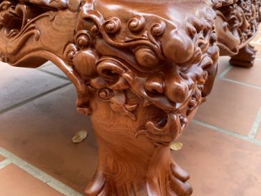 Bàn lớn và đôn kẹp ghế được các nghệ nhân đục trạm tinh xảo đến từng chi tiết nhỏ, khắc họa chân thật hình ảnh những Linh Vật trong truyền thuyết lên bề mặt gỗ rất nổi bật.