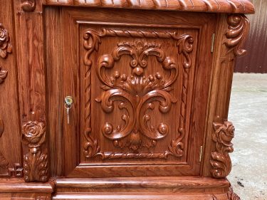 Thiết kế lồi ở giữa của kệ TV tạo ra một vẻ đẹp lôi cuốn và quý phái, đồng thời là điểm nhấn thu hút ánh nhìn ngay từ cái nhìn đầu tiên. Sự tỉ mỉ và công phu trong từng chi tiết chạm khắc trên bề mặt gỗ hương tạo nên một vẻ đẹp hoàng gia và truyền thống, mang lại cảm giác ấm áp và gần gũi.