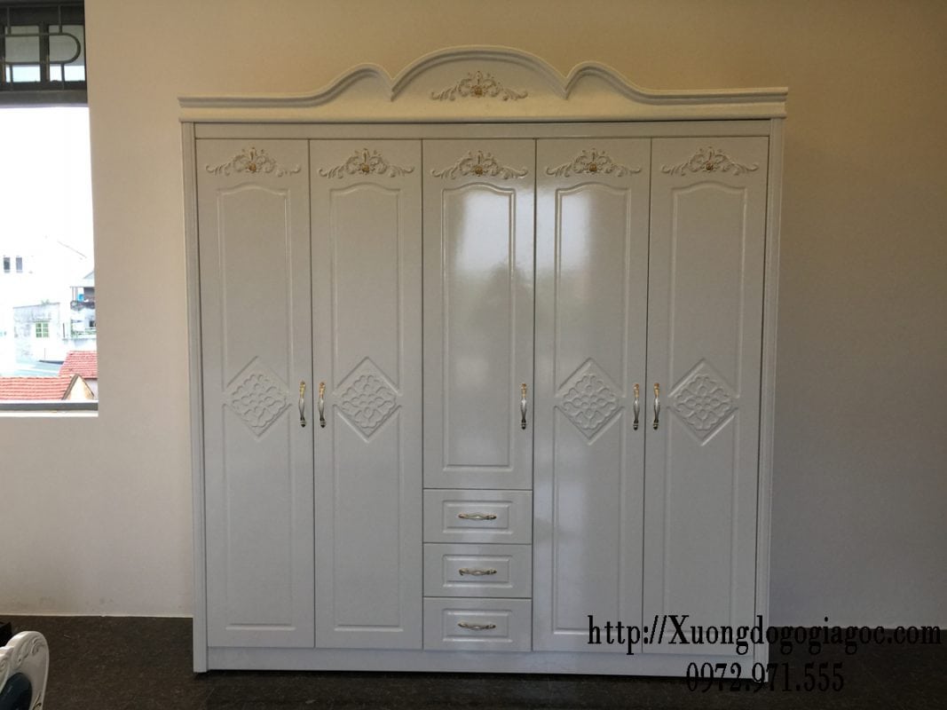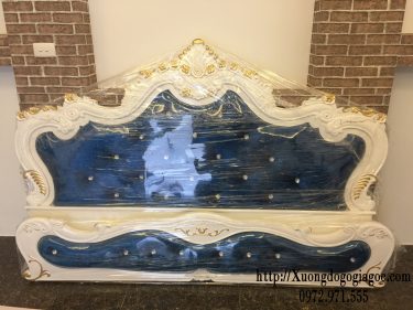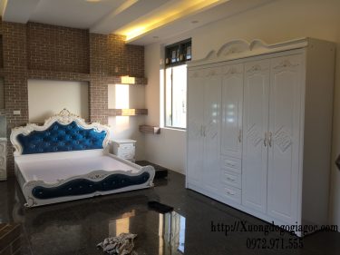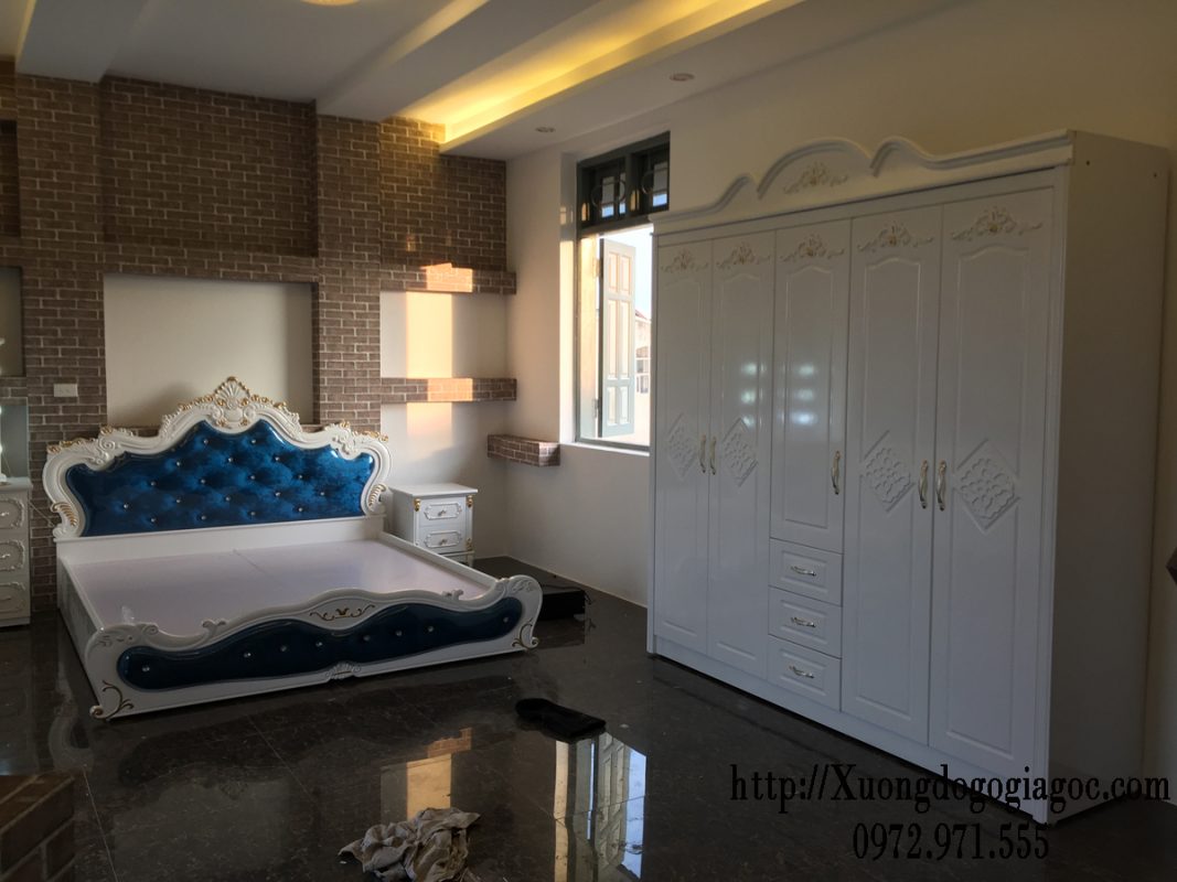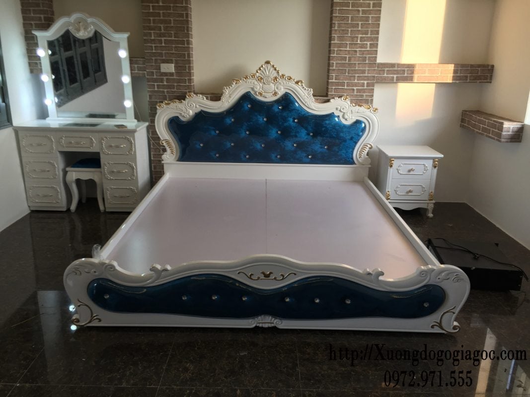 Trọn bộ nội thất phòng cưới tân cổ điển sơn PU trắng bọc da xanh, gồm: Giường bọc đệm nhũ vàng gỗ MDF nhập khẩu + Tủ áo + Bàn trang điểm + Táp đầu giường.